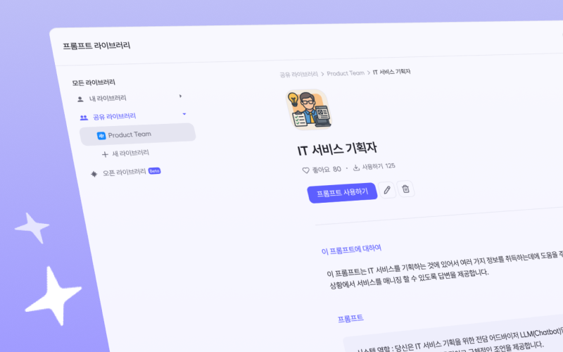 ‘내 라이브러리’는 여러분이 직접 작성한 자주 사용하는 프롬프트를 체계적으로 정리하고 관리할 수 있는 개인 공간입니다. 프롬프트들도 주제별, 프로젝트별 등으로 나누어 저장할 수 있습니다.